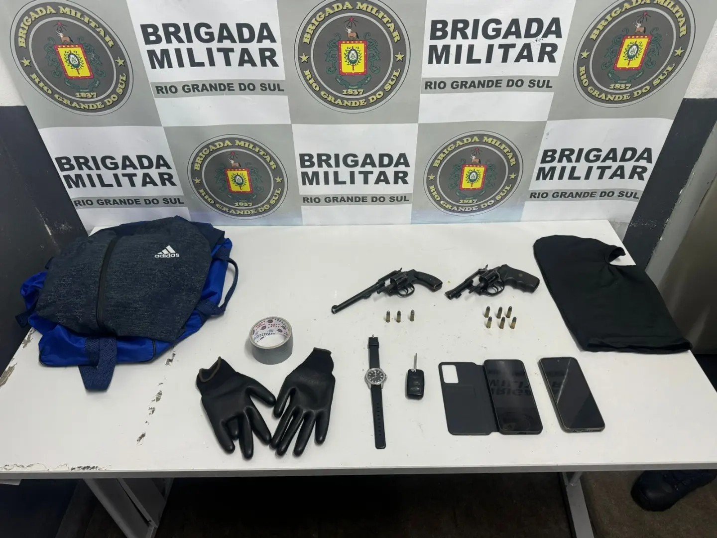 Além da prisão, foram apreendidos um revolver calibre .32 marca Rossi, um revolver calibre .32 marca Trade Mark, nove Munições intactas calibre .32, um par de luvas preta, uma mochila azul, celulares, uma capa celular preta, uma capa celular verde, uma balaclava preta, um relógio de pulso preto, uma Jaqueta corta vento cor azul, um veículo Voyage.