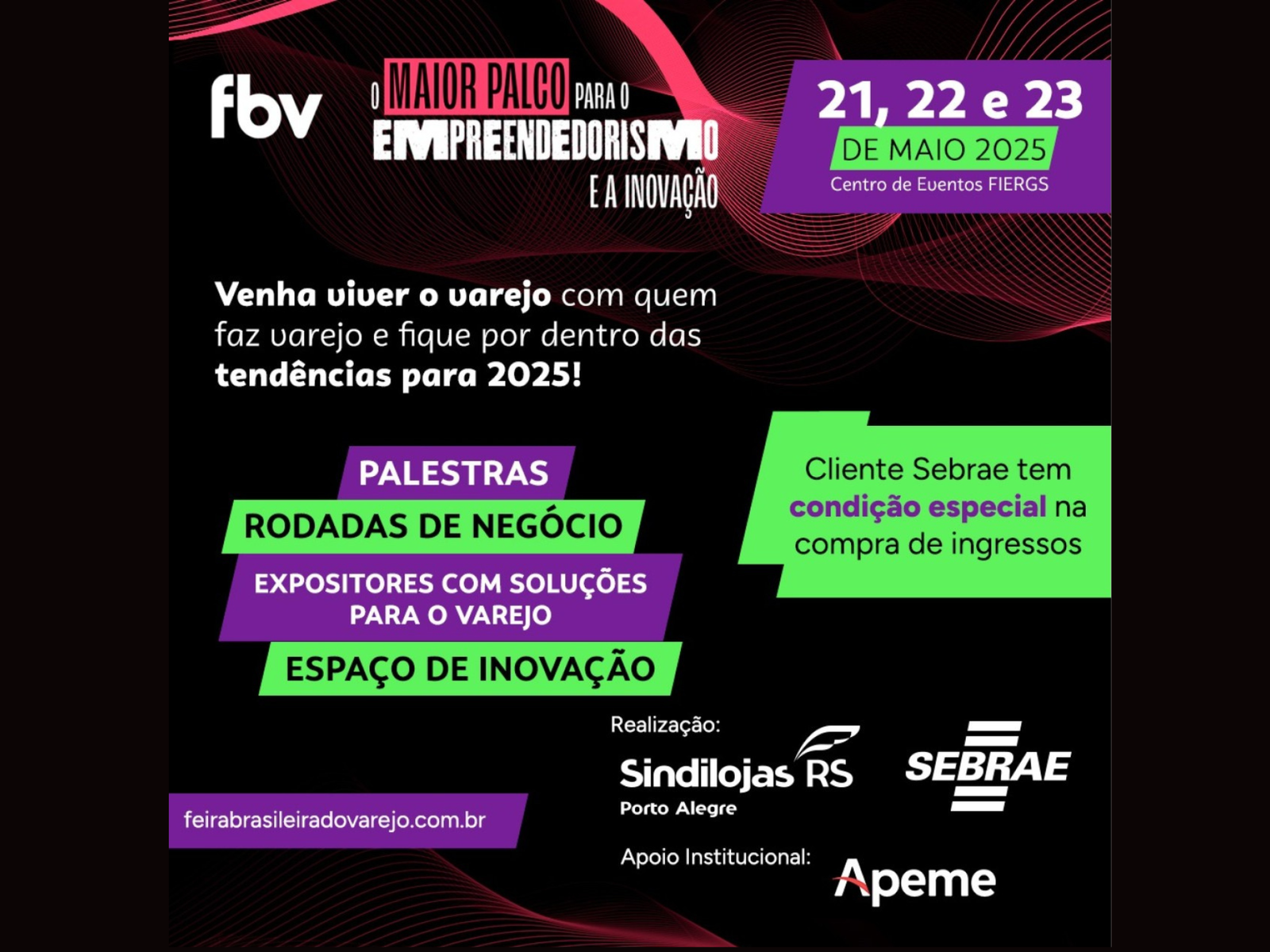 Associados à Apeme (Associação de Pequenas e Médias Empresas de Garibaldi) interessados em participar da Feira Brasileira do Varejo (FBV) terão desconto de 50% no valor dos ingressos. O valor diferenciado foi possível graças a uma parceria entre a entidade e o Sebrae. O evento acontece nos dias 21, 22 e 23 de maio, no Centro de Eventos da Fiergs, em Porto Alegre.