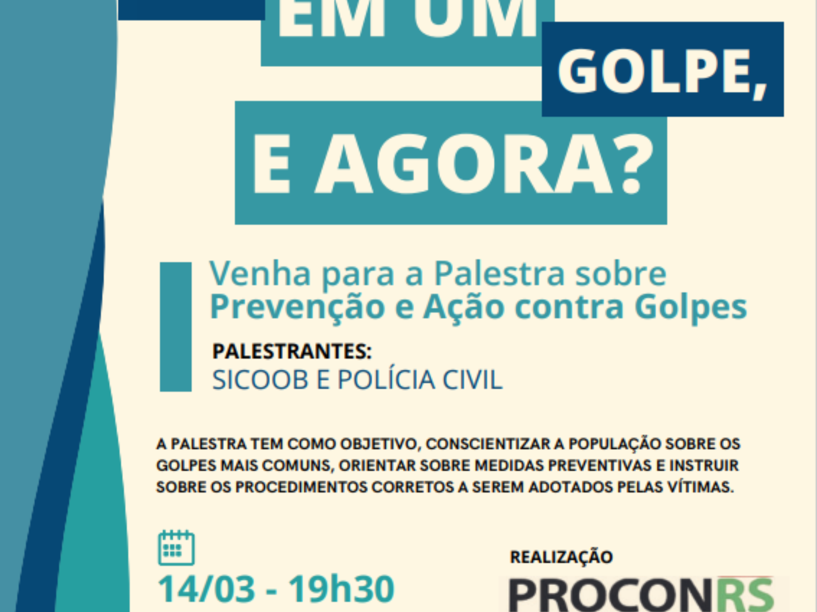Na próxima sexta-feira, dia 14 de março, o PROCON de Carlos Barbosa realizará uma palestra gratuita para informar e conscientizar a população sobre as fraudes e golpes financeiros em que todos os cidadãos estão suscetíveis a qualquer momento.